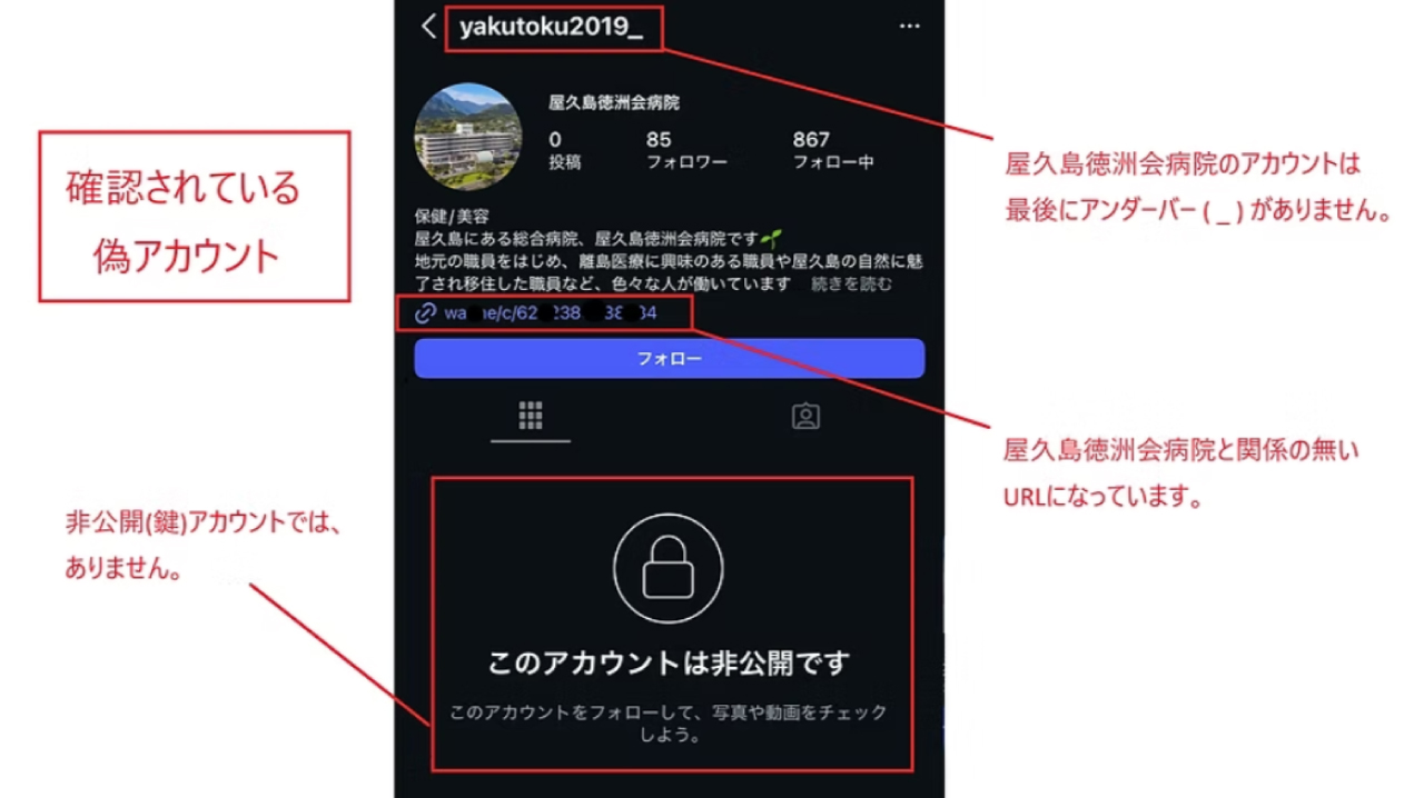 屋久島徳洲会病院のInstagram(インスタグラム)のアカウントを装った「なりすましアカウント(以下、偽アカウント)」が確認されています。