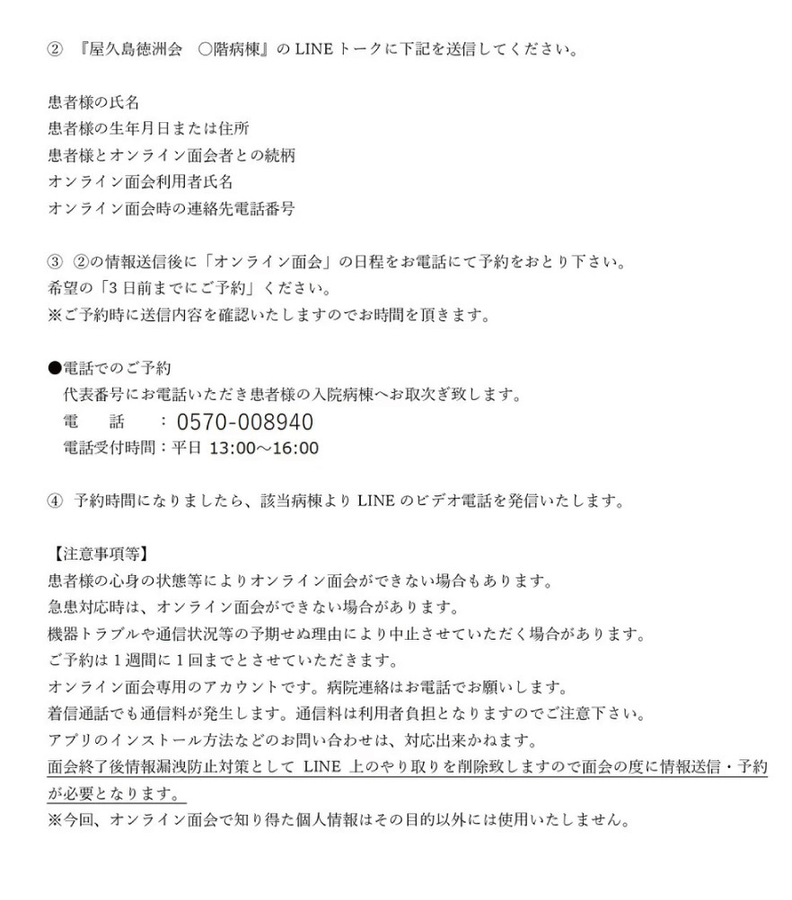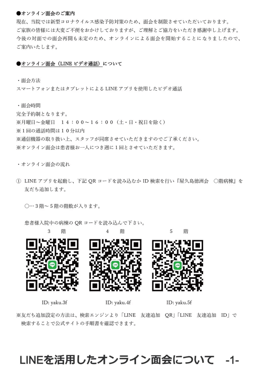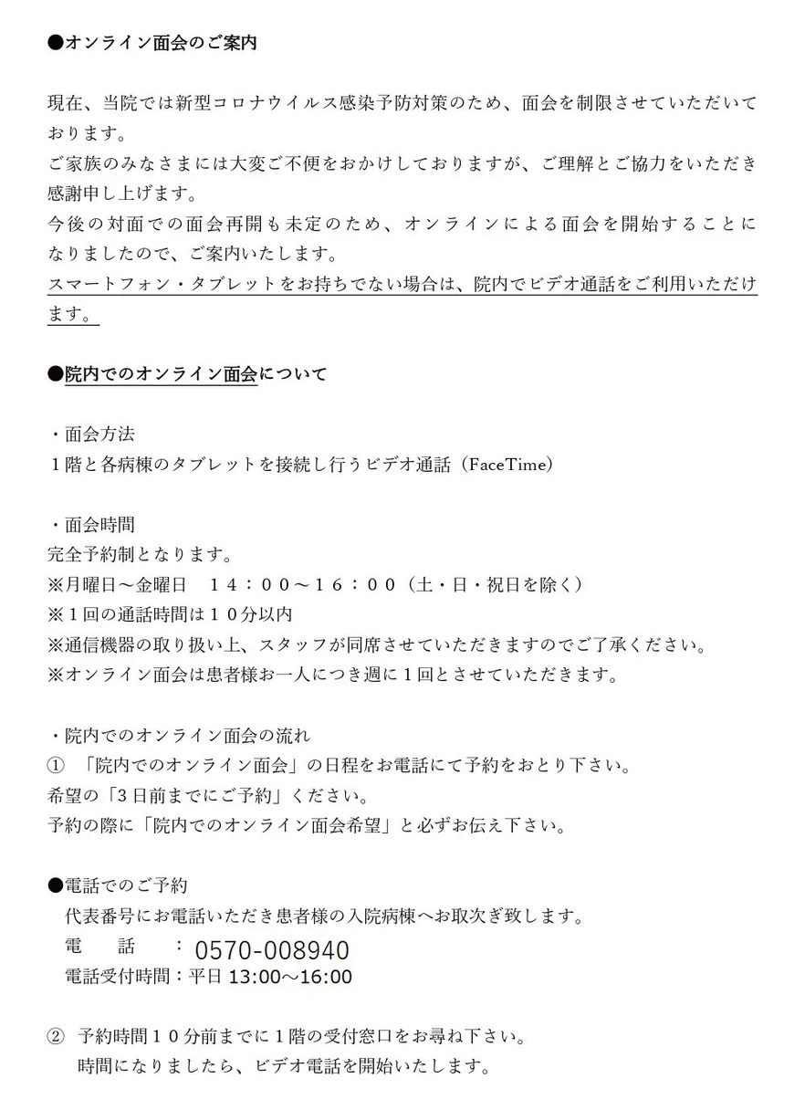 病院からのお知らせchevron_rightお知らせchevron_right面会制限に伴うオンライン面会について
