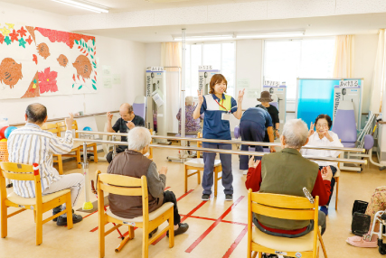 要支援、要介護の認定を受けた介護被保険者の方々を対象に、個別リハビリテーション、パワーリハ、サーキットトレーニング、創作活動、音楽療法、自主訓練指導など、利用者様に必要なメニューを理学療法士や作業療法士を中心に、介護職員と共に話し合いのもと利用計画を立てて実践していきます。利用時間は終日コースと午前半日コースになります。
