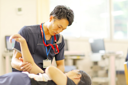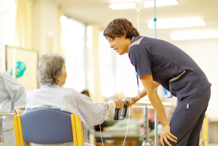 入院リハビリテーションや外来リハビリテーションはもちろん、訪問リハビリテーションや通所リハビリテーション、介護予防の地域リハビリテーション活動など介護分野のリハビリテーションも行っています。島内のリハビリテーションを必要としている人全てが対象で、難病や小児のリハビリテーションも行っています。また、病気や怪我をした急性期から在宅に帰った後の生活期まで全ての病期のリハビリテーションを行っています。